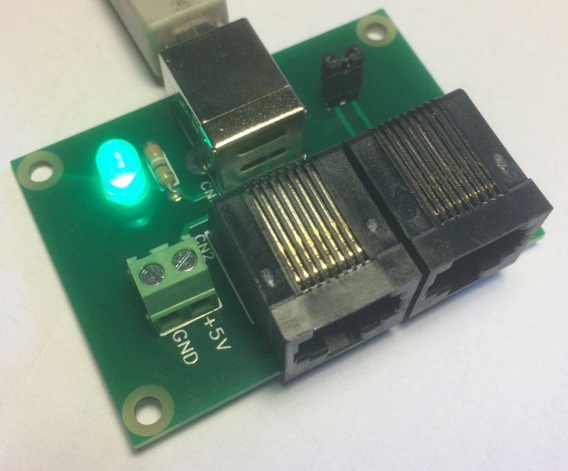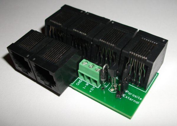 PCB with multiple RJ45 sockets to allow easy connection of several SWE0 sensors to your 1-Wire network. Also has a DS18B20 temperature sensor on the PCB.